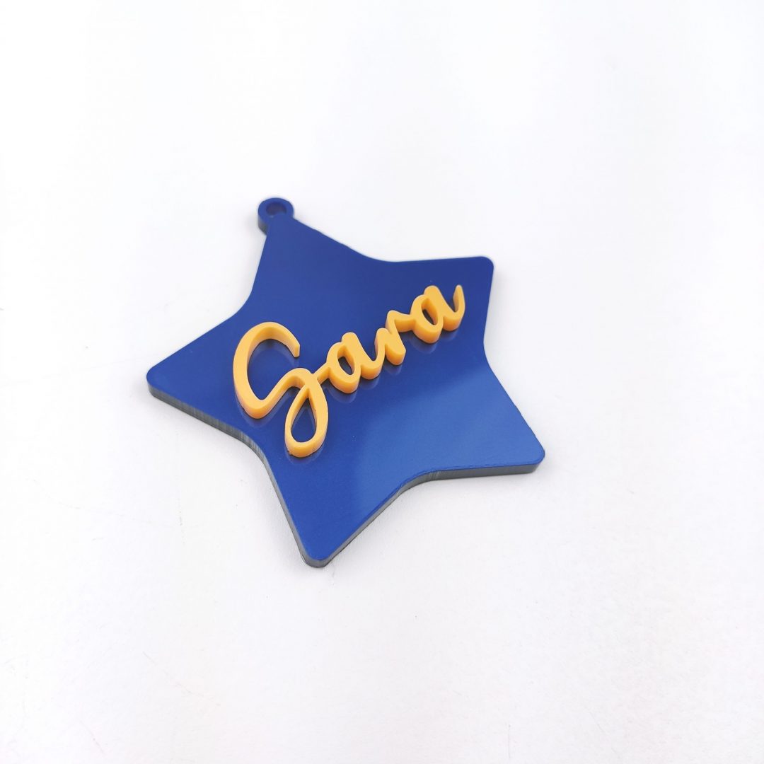 Adorno navideño personalizable de metacrilato con nombre en relieve y forma a elegir entre bola y estrella.