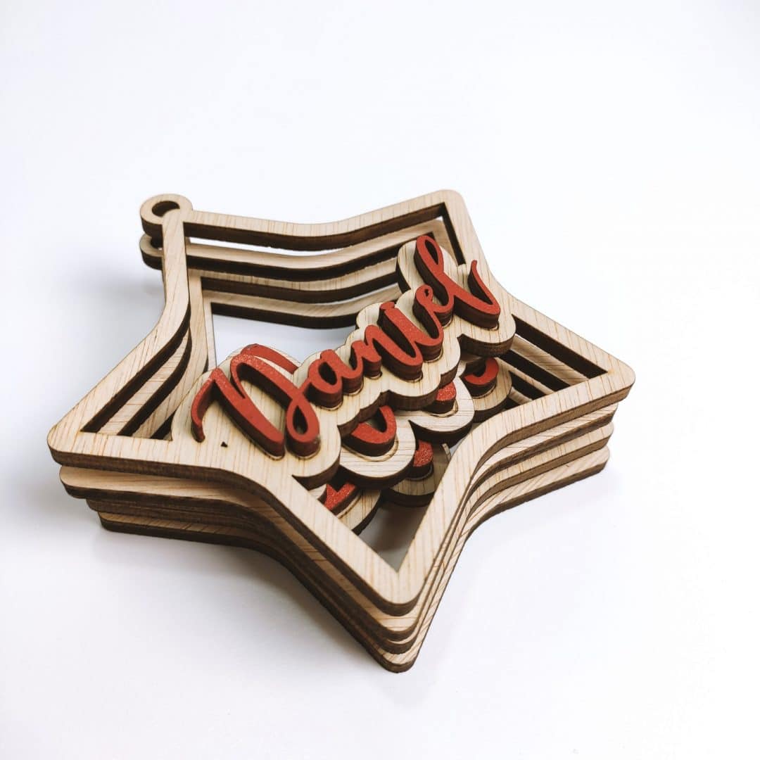 Adorno navideño con forma de estrella y nombre en relieve.